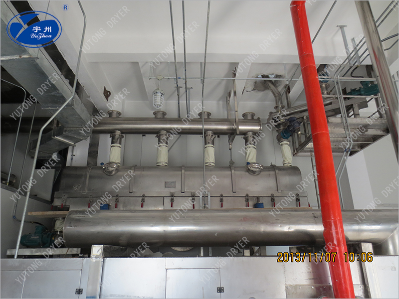③ Due to the application of vibration, the minimum fluidizing gas speed can be reduced, so the air demand can be significantly reduced, and then the dust layer entailing can be reduced, the matching heat source, fan, cyclone separator, etc., can also be reduced accordingly, the complete set of equipment is reduced, and the energy saving effect is obvious. The in-machine residence time can be easily changed by adjusting vibration parameters. The operation of the piston flow reduces the requirements of material particle size uniformity and regularity, and it is easy to obtain uniform dry products.