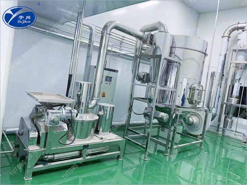 The material enters the crushing chamber through a hopper and a screw conveyor. The crushed material is sheared by high-speed blades to obtain pulverization. The material is then transported into a cyclone separator, bag filter, and discharged to meet the requirements of the product through negative pressure air transportation.