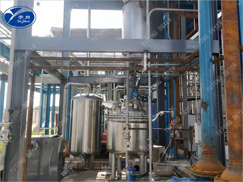 物料從加熱區(qū)的上方徑向進(jìn)入蒸發(fā)器,經(jīng)布料器分布到蒸發(fā)器加熱壁面,然后旋轉(zhuǎn)的刮膜器將物料連續(xù)均勻地加熱面上刮成厚薄均勻的液膜,并以螺旋狀向下推進(jìn)。在此過程中,旋轉(zhuǎn)的刮膜器保證連續(xù)和均勻的液膜產(chǎn)生高速湍流,并阻止液膜在加熱面結(jié)焦、結(jié)垢,從而提高傳總系數(shù)。輕組份被蒸發(fā)形成蒸汽流上升,經(jīng)汽液分離器到達(dá)和蒸發(fā)器直接相連的外置冷凝器,重組份從蒸發(fā)器底部的錐體排出。 一個獨特的布料器不僅僅具有將物料均勻地流向蒸發(fā)器內(nèi)壁,防止物料濺到蒸發(fā)器內(nèi)部噴入蒸汽流,還具有防止剛進(jìn)入的物料在此處閃蒸,有利于泡沫的消除,物料只能沿著加熱面蒸發(fā)。在刮膜蒸發(fā)器的上部配有一個依據(jù)物料特性設(shè)計的離心式分離器,將上升蒸汽流中的液滴分離出來并返回布料器。