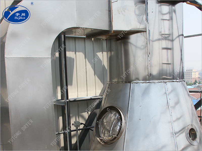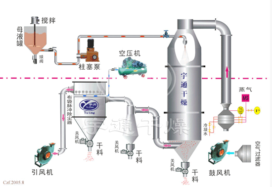 空氣通過濾清器進入加熱器,交換成熱空氣,進去干燥室頂部的熱空氣分配器,使空氣均勻呈旋轉(zhuǎn)狀或平行軸線進入干燥室。料液需經(jīng)過篩后由高壓泵送至設(shè)在干燥室頂中心的噴嘴,將料液均勻的霧化,使液滴的表面積大大增加,與熱空氣相遇接觸,使水份迅速蒸發(fā),在極短的時間里干燥成為顆粒產(chǎn)品,大部分產(chǎn)品由設(shè)在塔底部出料口收集,廢氣和微小粉粒經(jīng)旋 風(fēng)分離器分離,成品由旋風(fēng)分離器下端收集筒收集,廢氣由抽風(fēng)機排出。