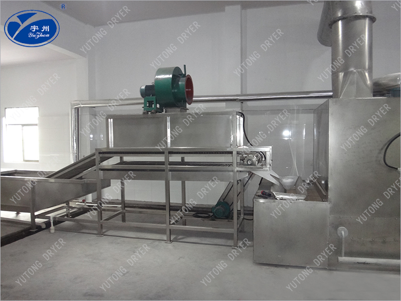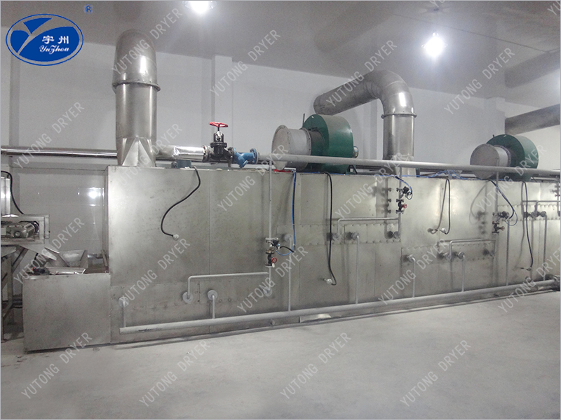 物料由加料器均勻地鋪在網(wǎng)帶上,網(wǎng)帶采用12-60目不銹鋼絲網(wǎng)。由傳動裝置拖動在干燥機內(nèi)移動。干燥機由若干單元組成,每一單元熱風獨立循環(huán),部分尾氣由專門排濕風機排出,廢氣由調(diào)節(jié)閥控制,熱氣由下往上或由上往下穿過鋪在網(wǎng)帶上的物料,加熱干燥并帶走水分。網(wǎng)帶緩慢移動,運行速度可根據(jù)物料溫度自由調(diào)節(jié),干燥后的成品連續(xù)落入收料器中。上下循環(huán)單元根據(jù)用戶需要可靈活配備,單元數(shù)量可根據(jù)需要選取。