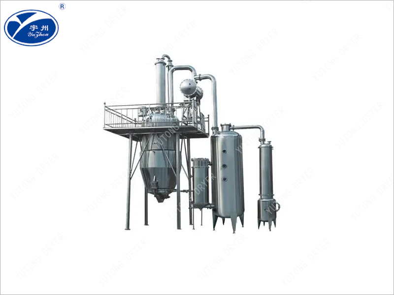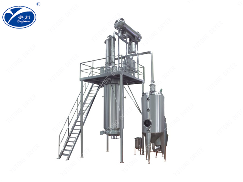 Вторичный пар продолжает подниматься и конденсируется в тепловой конденсат через конденсатор. Затем он возвращается в резервуар для извлечения и добавляется на поверхность препарата в качестве нового растворителя. Новый растворитель проходит через фармацевтический слой сверху донизу и достигает дна резервуара для извлечения. Растворимые активные ингредиенты в лекарственных травах растворяются в растворителях. Экстракт вдыхается в концентратор через фильтрующую трубку, а вторичный пар, образующийся в результате концентрации, подается в резервуар в качестве источника тепла и нового растворителя. Это создает большой цикл обратного потока для извлечения новых растворителей. Таким образом, плотность раствора в препарате поддерживается на высоком градиенте с концентрацией раствора в растворителе, а раствор в препарате растворяется с высокой скоростью. После экстракции экстракт полностью всасывается в концентратор, а концентрированный вторичный пар подается в охладитель. Продолжайте концентрироваться до тех пор, пока мазь с требуемым удельным весом (1,2 - 134) не будет концентрироваться и выпущена для последующего использования. Остаток жидкости извлекается из резервуара и помещается в резервуар для повторного использования в следующей партии. Остатки лекарства выводятся из шлаковой двери. Если экстрагировать с помощью органического растворителя, сначала добавьте соответствующее количество воды, откройте прямую трубку и пар втулки, переработайте растворитель, а затем выпустите остатки.